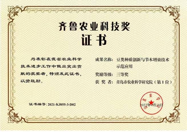 获奖证书 图片来源:青岛市农业农村局