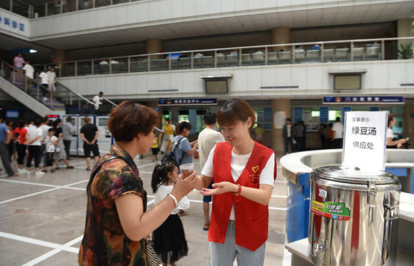 “阿姨,绿豆汤接好了,请您小心慢用。”7月4日上午,灵宝市第一人民医院门诊大厅,党员志愿者苏园把接好的“爱心绿豆汤”递给就诊患者。