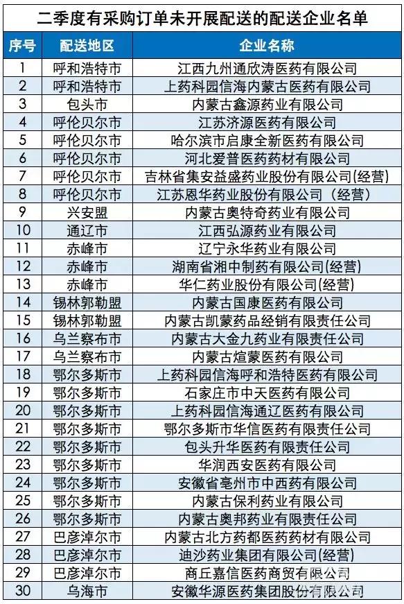 优米体育服讯(记者 胡毅) 9月2日,内蒙古自治区卫生健康委员会发布了《关于2019年第二季度全区药品集中采购考核情况的通报》。通报公布了内蒙古自治区2019年第二季度定期考核结果,其中30家配送企业、20家生产企业被通报批评,包括九州通、华润、国药等药企旗下子分公司。