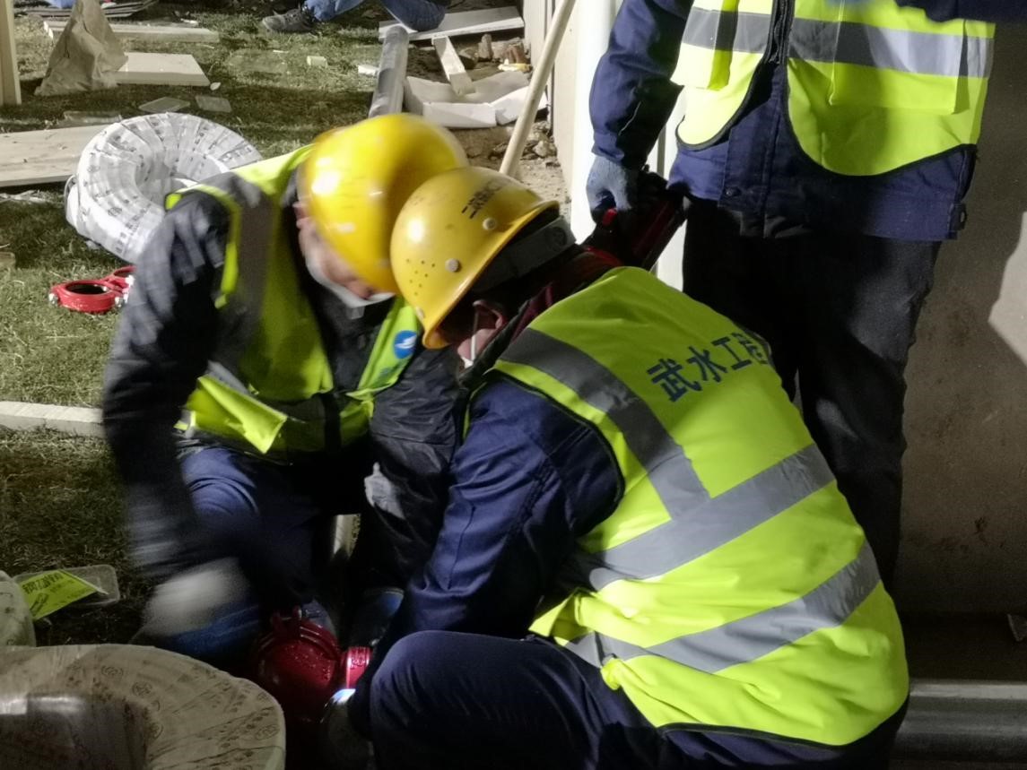 2 月 19 日 20:00 左右,武水集团接在到铺设长江新城方舱医院的紧急任务后,立即组织管道建设方面的精锐力量,向现场集结。该集团参加过“火神山”“雷神山”供水保障攻坚战的水务工程公司的建设者、刚结束其他方舱医院管道铺设的汉口供水部和汉阳供水部的服务人员、有楼房管道铺设专业经验的三镇房地产公司的技术人员组成了 100 多人的突击队,连夜进驻长江新城方舱医院抢铺管道。