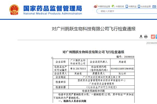 2019 年 9 月 2 日,国家药品监督管理局曾发布对腾跃生物的飞行检查通报,称该公司存在严重缺陷 9 项,一般缺陷 12 项,包括已过期的 5 个品种 36 桶半成品、过期原料如冰片无清晰标识,未专区存放;企业部分生产区域布局不合理,可能引入污染等。最终责令该企业停止暂停所有化妆品生产销售,对企业涉嫌违法违规生产行为依法严肃处理。